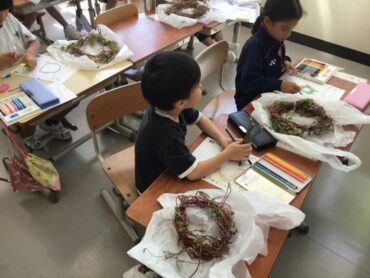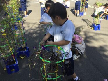 2025.9.24 9/24 1年生「あさがおリース作り」 育ててきたあさがおでリース作りをしました。ペアでつるを支柱から外したり、リースの形に整えたりして学習しました。色水あそび、押し花作り等、たくさんの学習であさがおさんのお世話になりました。ありがとう あさがおさん!