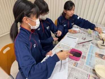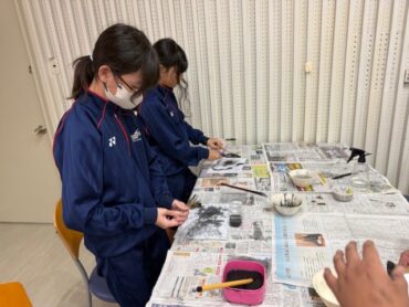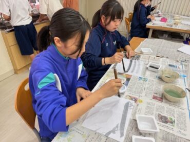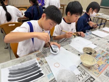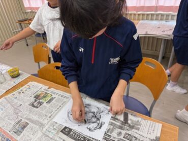 図画工作科では、「墨の達人」に扮して、墨の濃淡や筆の運び方を工夫したり、ダンボールや割り箸など身近な道具を使ったりして、思い思いに表現しました。子供たちの自由な発想が光る素敵な作品が仕上がりそうです。