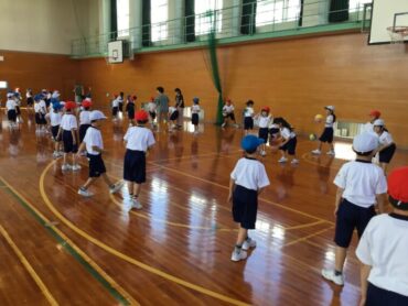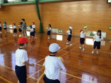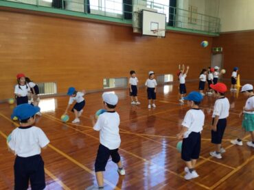 1年生は、体育館で思いっきり走ったり、ボールを使ったりしていろいろな運動遊びに挑戦しています。