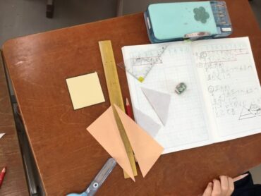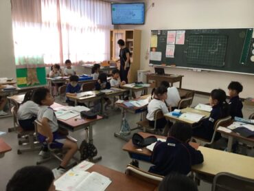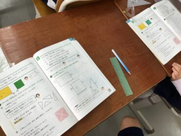 2年生は、長方形や正方形、直角三角形を算数で学習しています。図形の特徴を調べたり、実際に描いてみたりして理解を深めています。