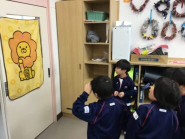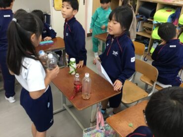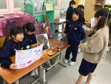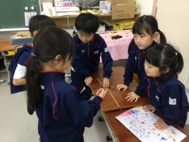 2025.11.10 11/10 1年生「秋のおもちゃ屋台オープン!」 秋のものを使ったおもちゃを作っている1年生。今日は1組の子供たちが2組を招待して、秋のおもちゃ屋台を開いてくれました。どんぐりを使ったこまやマラカス、松ぼっくりで作ったけん玉、落ち葉を用いたアクセサリー等、秋のもの満載の屋台がたくさん出ました。