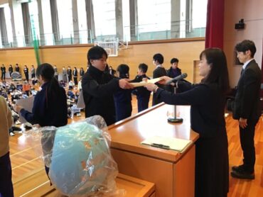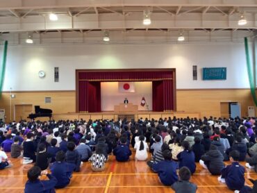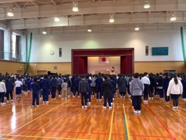生徒指導主事と開校マン、あいさつ3兄弟から冬休みの過ごし方についての話がありました。交通ルールや雪が降った際の注意点などの話を聞き、自分の命を守るのは自分自身ということを再確認しました。