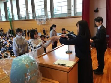 受賞伝達式、2学期終業式の様子です。受賞伝達式では、夏休みの応募作品や地域のスポーツ大会、「クリエイティブ・たかおか」の作品等、優秀な成績を収めた児童が表彰されました。