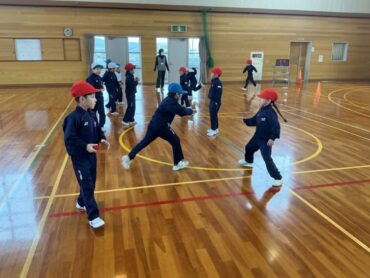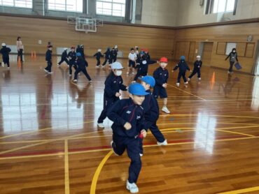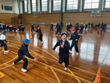 2026.3.3 NEW 3/2 1年生「玉運びゲーム」 1年生はゲーム遊びで、元気に体を動かして運動しました。ルールは簡単です。鬼にタッチされずに対極にある箱に玉を運びます。遊びの中で、どうしたら鬼にタッチされないかを考えながら楽しく学習しています。